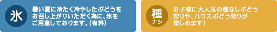お子様に大人気のぶどう「種無しデラウェア」をはじめ、ハチミツに似た甘みを持つ「スチューベン」、ぶどうの王様「巨峰」、皮ごと種なし「シャインマスカット」等のぶどう狩りが楽しめます。